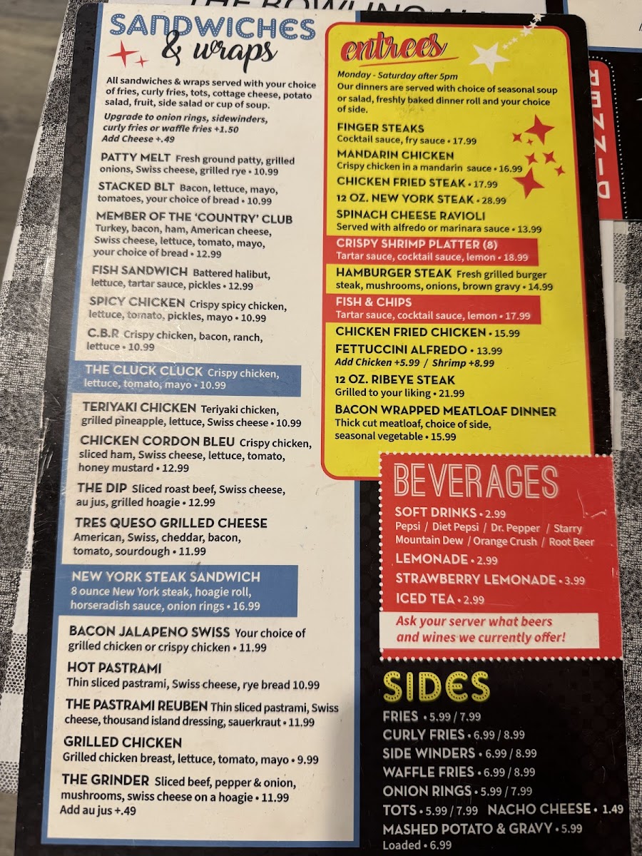 Complementing the food, refreshing beverages like strawberry lemonade and iced tea round out the experience, offering simple, pleasant choices to accompany any meal or social gathering. The menu’s balance of casual bites and more substantial plates mirrors the overall welcoming setting—making it easy to relax and savor each visit, whether you're stopping by for a quick bite or an evening meal before heading to the bowling lanes.
